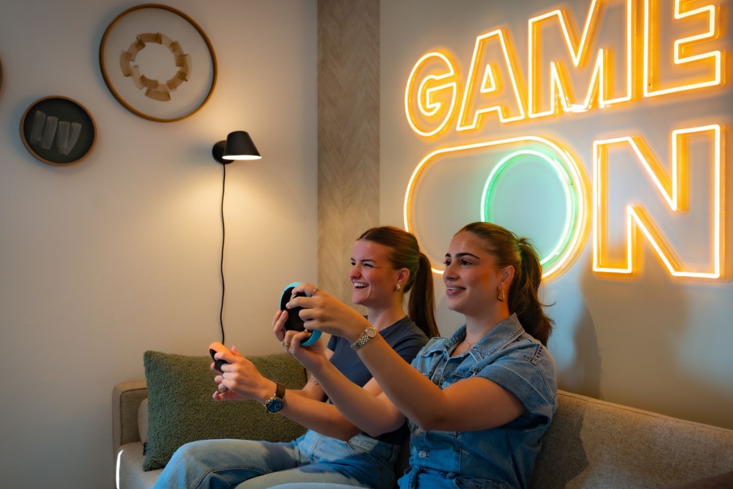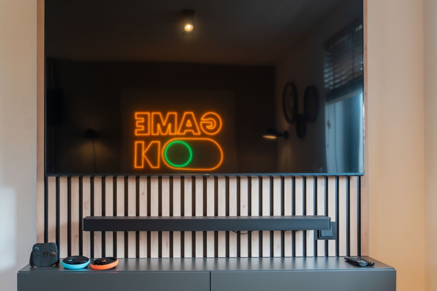 Die Wohnbereiche sind für den ultimativen Genuss konzipiert, einschließlich einer speziellen Blende und eines Schranks für die Soundbar und den Fernseher sowie stimmungsvoller "Game On"-Neonlichter, die die perfekte Atmosphäre schaffen.
