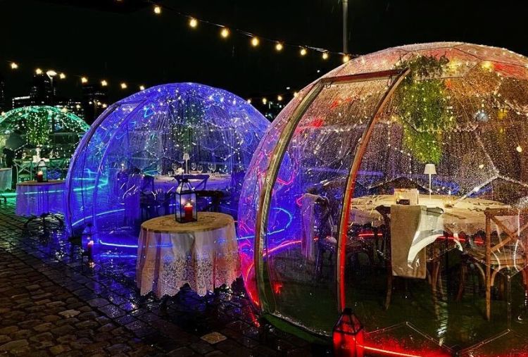 We feature three bespoke outdoor domes, each comfortably seating 4 to 8 guests. Forget the chill, your private heated dining pod is equipped with a Dyson heater and a Bluetooth speaker, letting you curate your own perfect ambiance. Subtle ambient lighting ensures a cozy, romantic glow long after the sun sets.